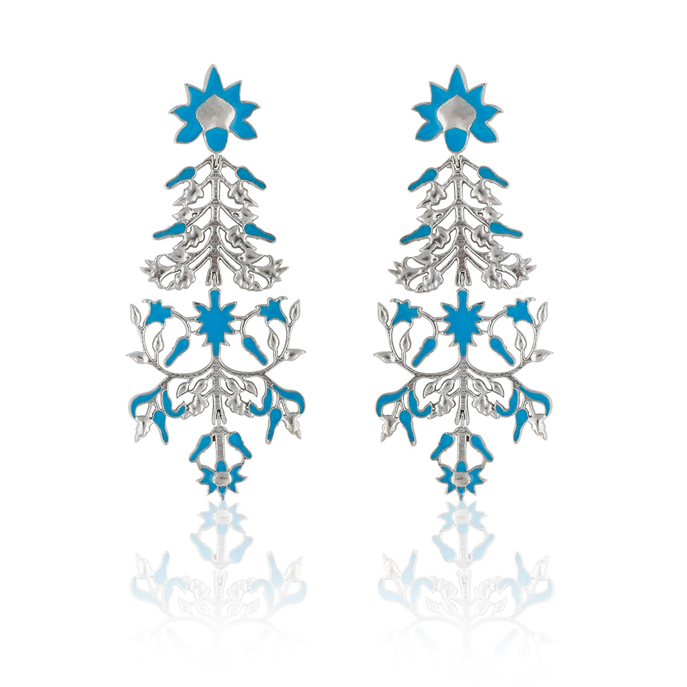 The detailed wall carvings and inlay work form inspiration for this earring. Detailed with blue enamel work.