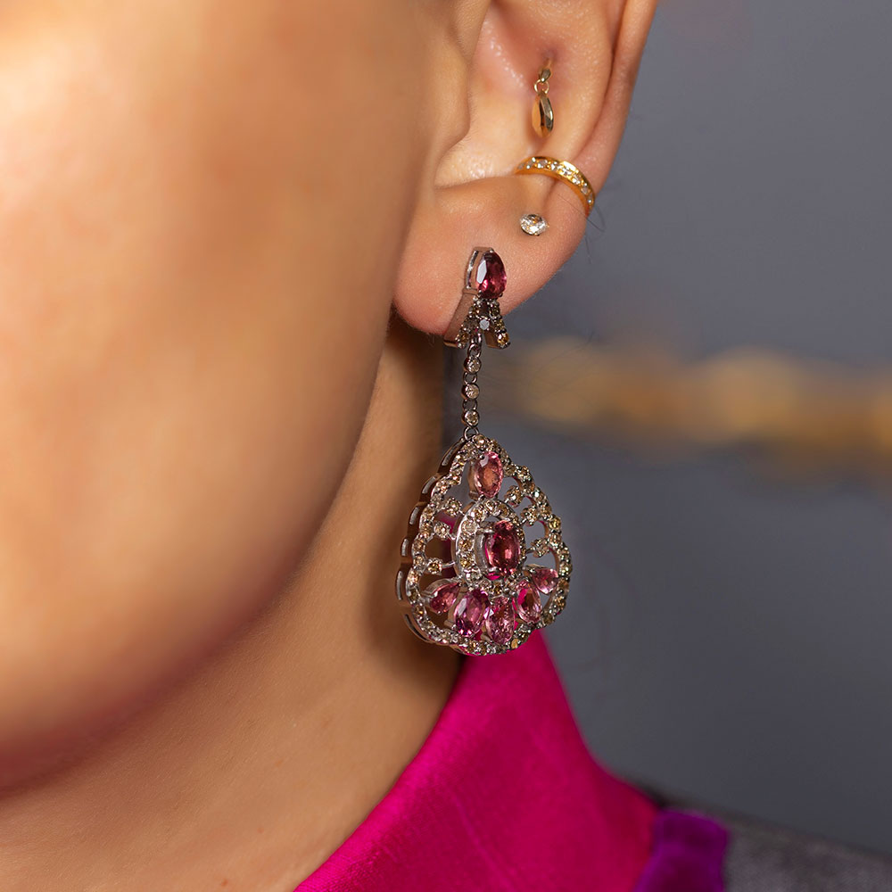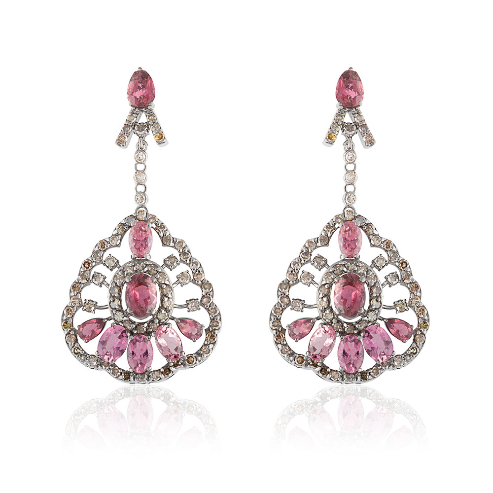 Delicately hand made with 8.82 carat of natural tourmaline and 2.97 carat of natural single cut diamonds set on silver with 14kt gold push backs for the ear lobes.