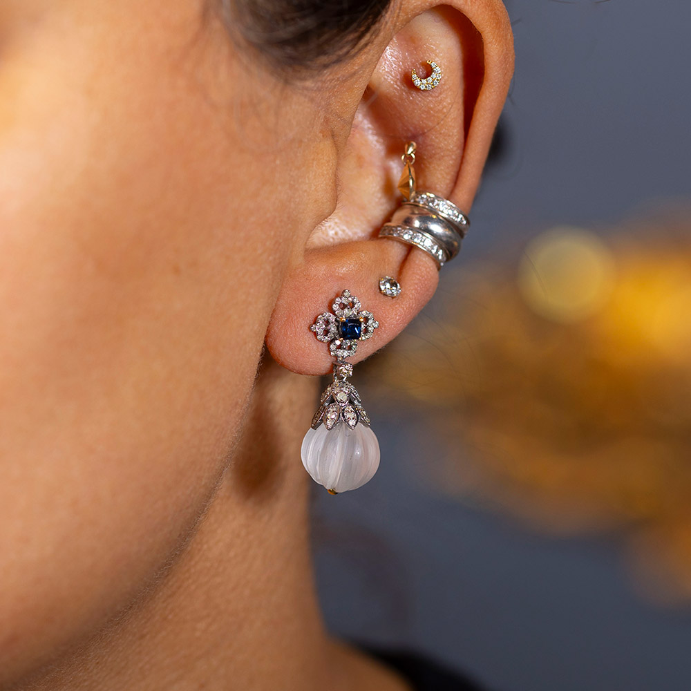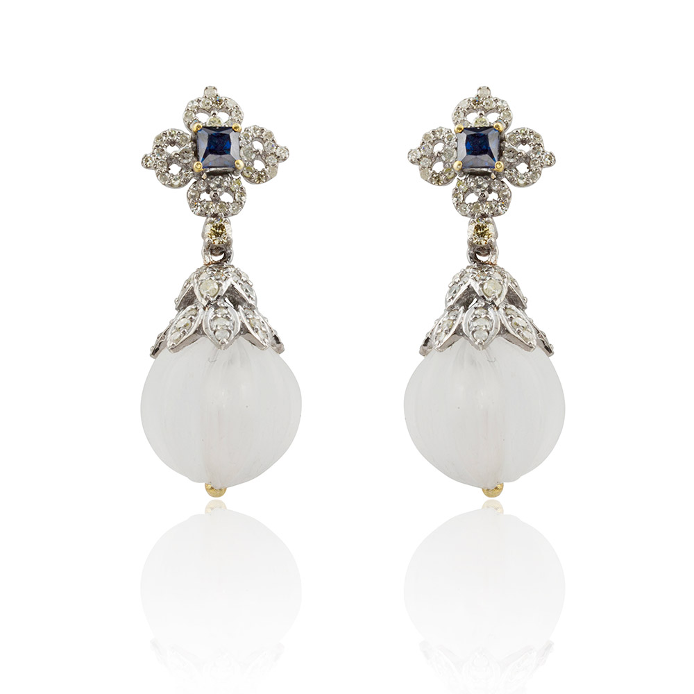 Beautifully curated & detailed with 21.50 carat of carved crystal quartz; 0.46 carat sapphire; 0.80 carat single cut diamonds; set on silver and 14kt gold stems for the ear lobes. Inspired by ancient art deco styles of jewellery.