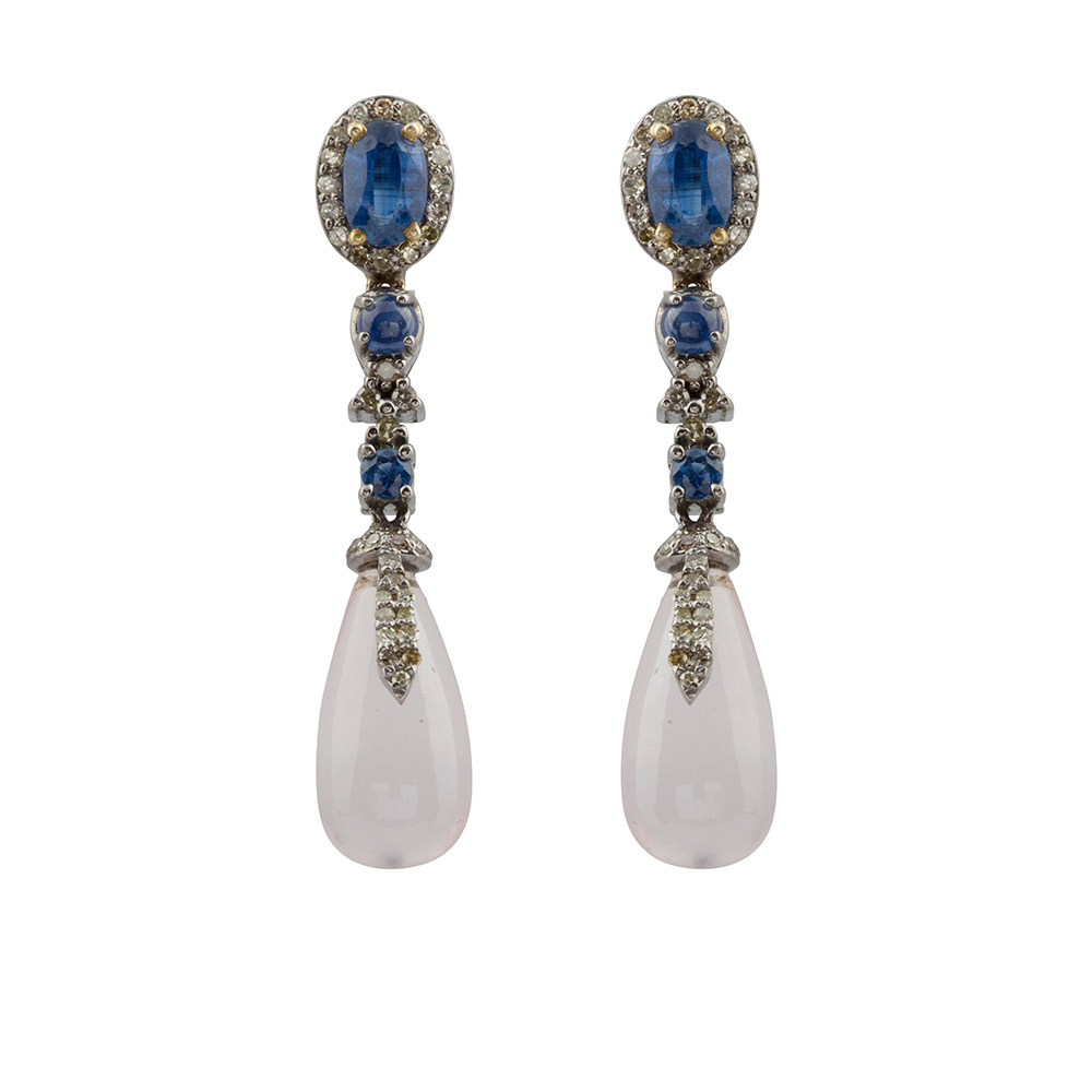 Reflective of art deco antique jewel ideas. This earring is detailed with 4 different gem types: sapphires, rose quartz, kunzite & single cut diamonds; set on silver and 14kt gold stems for the ear lobes.