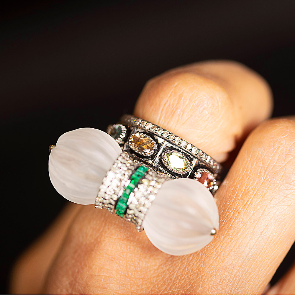 2.19 carat of natural tourmalines & 0.93 carat of natural single cut diamonds are set on silver, the inside of the ring – the part that touches the skin has a delicate design filigree work in 14kt gold.