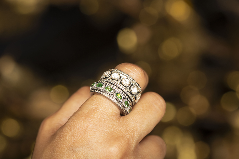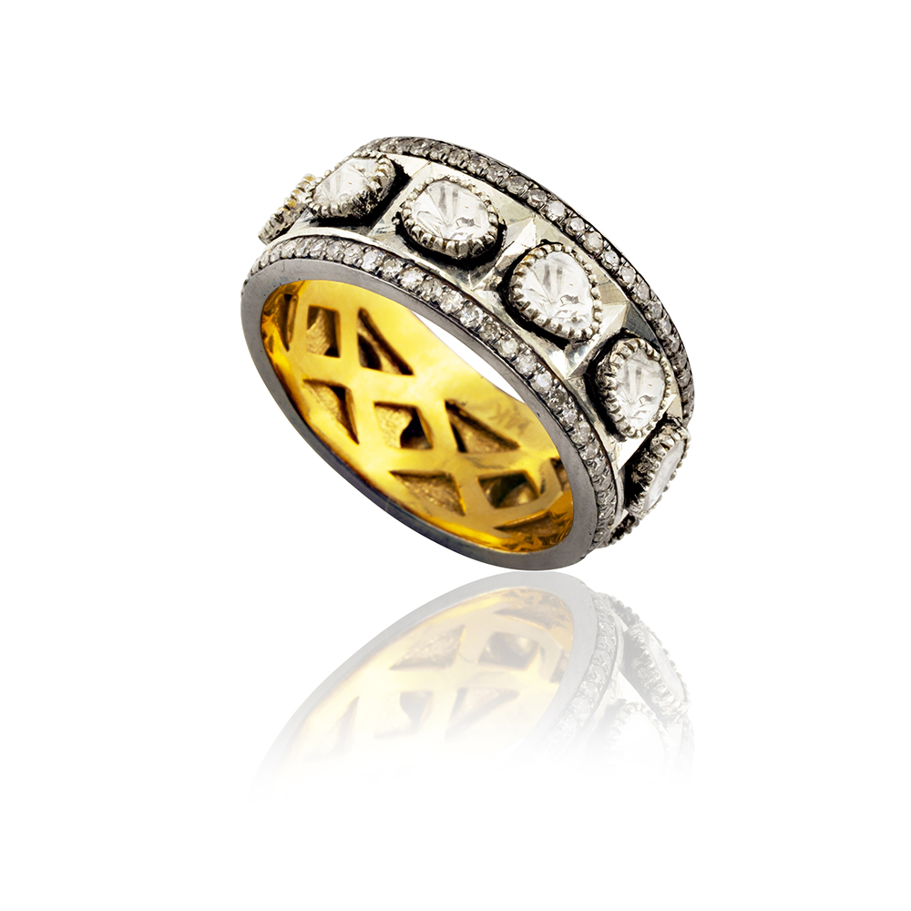 Featuring 0.76 carat of uncut natural diamonds using an ancient 15th century foil technique of setting ; 1.01 carat single cut diamonds; 1.6 grams 14 kt gold and 4.5 grams silver.