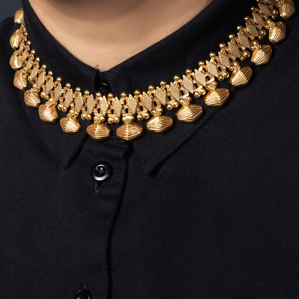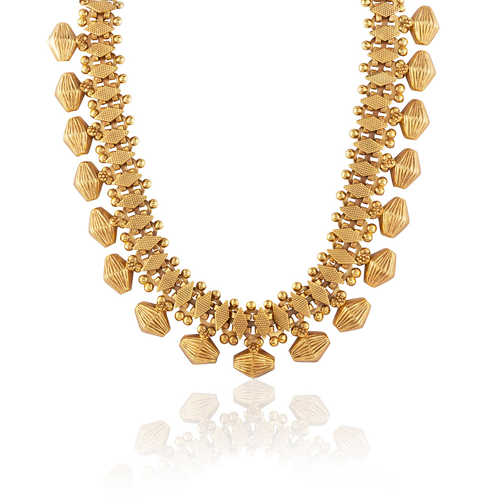 22kt gold plated on silver. A really wonderful piece, all hand crafted based on ancient necklace ideas, very typical of old Indian neckpieces but also on looking through archives resemblant of old French and Victorian necklace looks. This piece has pretty detailing of on geometric patterns and amulet charms.