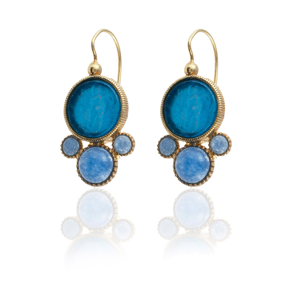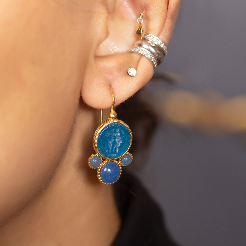 The earrings features ancient Greek Gods imprinted onto onto a Jodhpur blue stone coloured shade of venetian glass with quartz detailing.