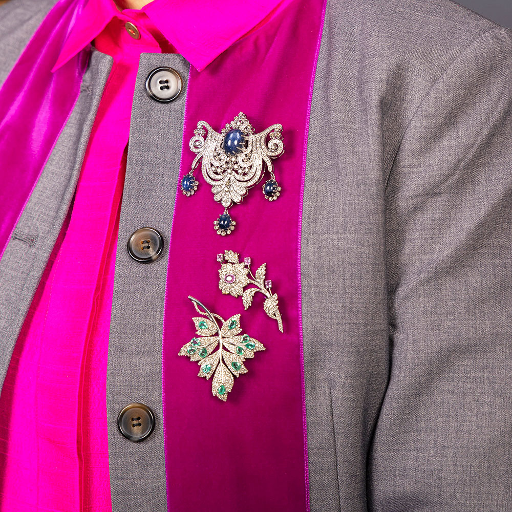 Inspired by the archives of grand brooches adorned by royalty from 17th century France to modern day England. This piece has been intricately hand crafted & set on silver with 20.61 carat of natural cabochon blue sapphires & 3.88 carat natural single cut diamonds.