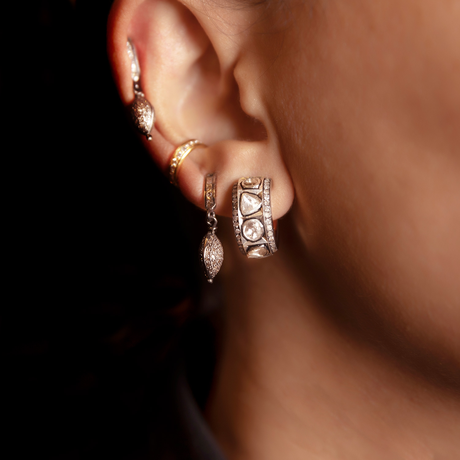 A pair of simple single cut diamond drop earrings in an antique finish set with 1 gram 14kt gold & silver. Perfect stacking earring & great gift!