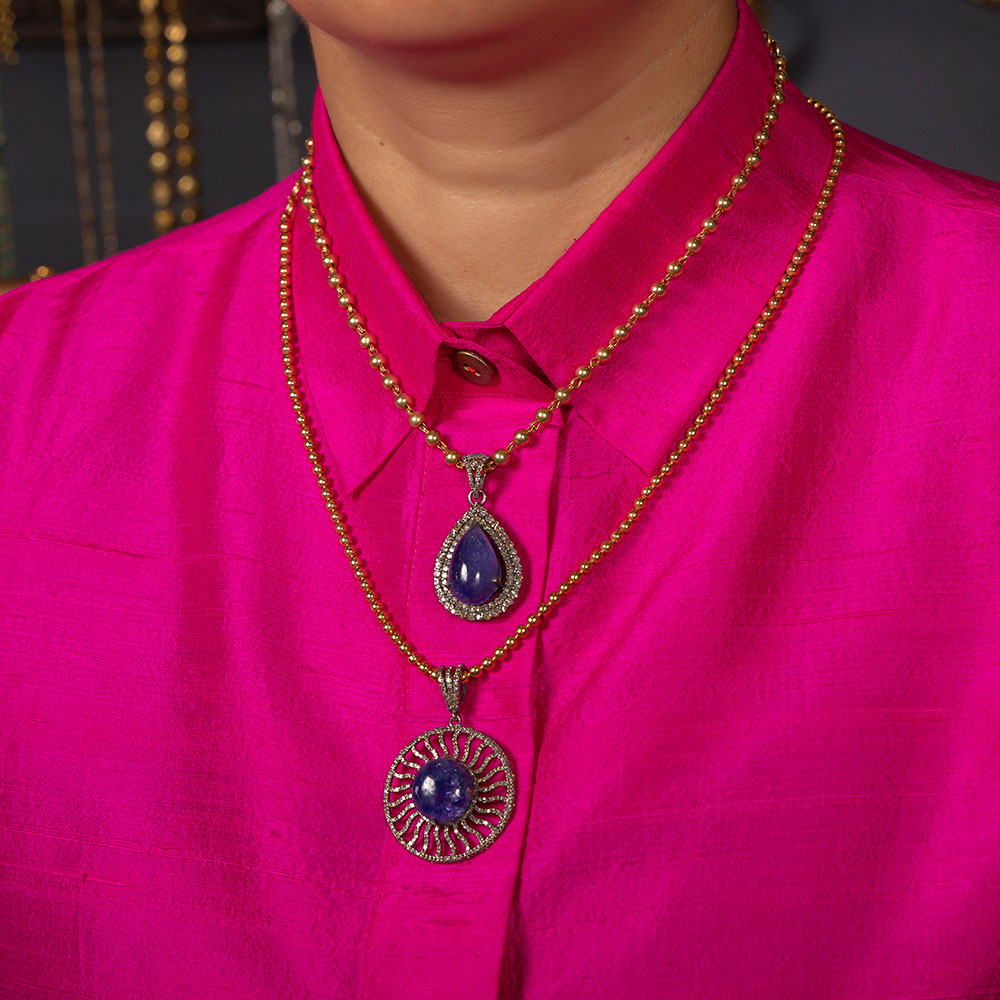A simple pendant set with 15.10 carat natural Tanzanite & 1.40 carat natural single cut diamonds on silver.