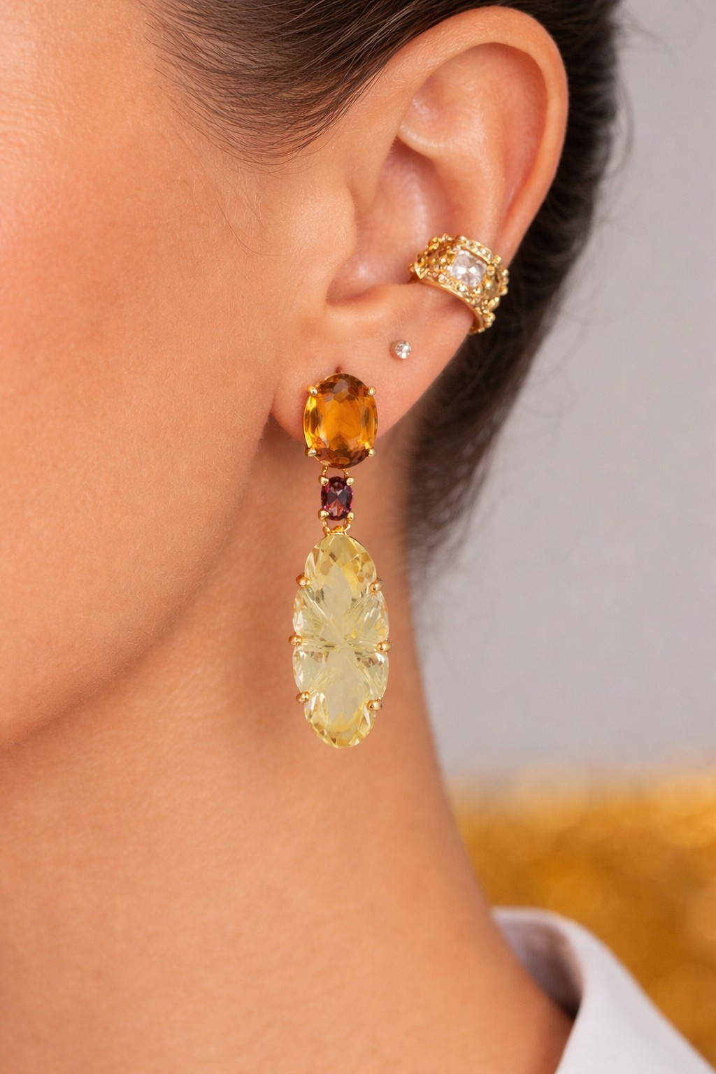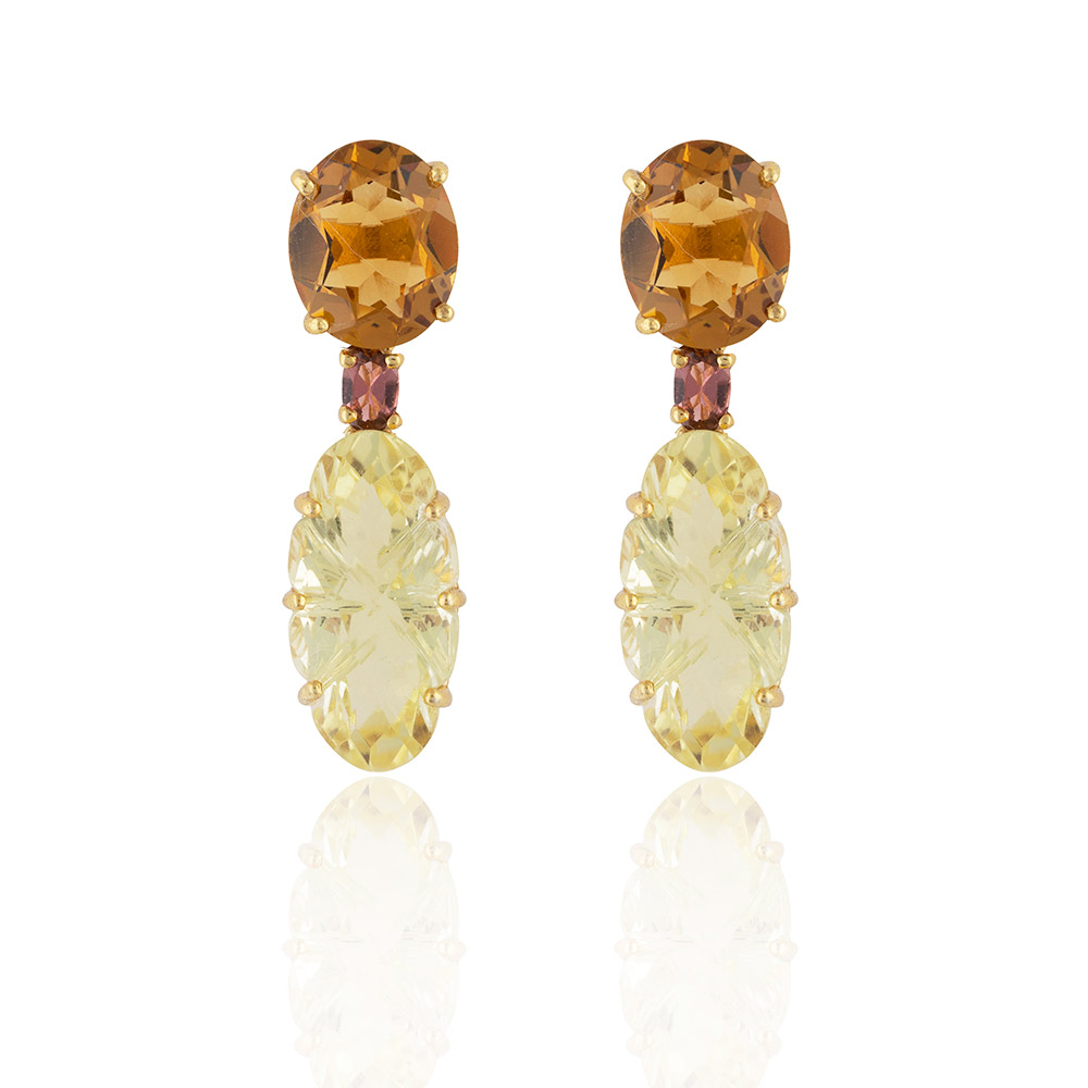 Set on silver with a gold plate; using 5.54 carat of high citrines; 0.42 carat of tourmalines; 13.46 carat of quartz.